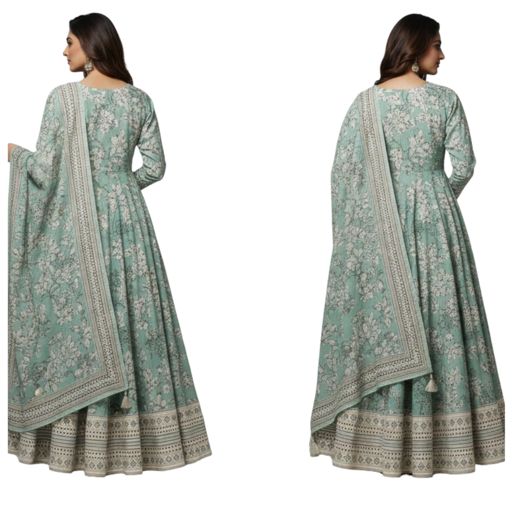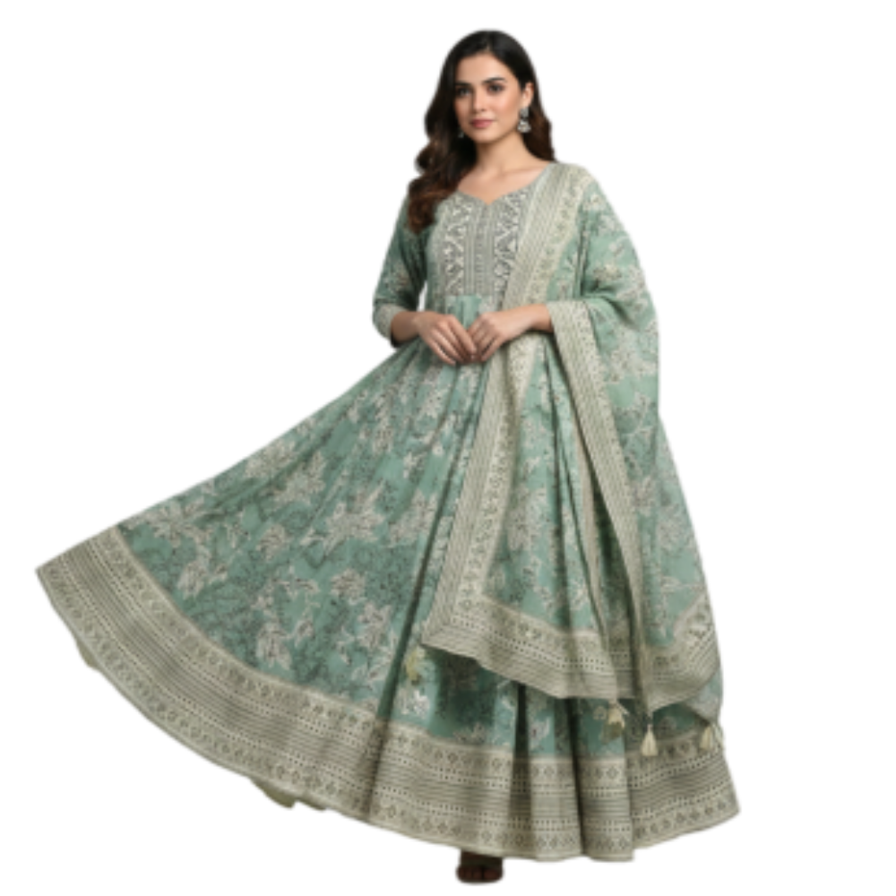 Elevate your festive and everyday ethnic look with this premium mint-green floral Anarkali set, crafted to make you feel effortlessly graceful the moment you wear it. Designed with a rich flare, intricate border detailing, and soft breathable fabric β this outfit blends traditional charm with modern comfort.